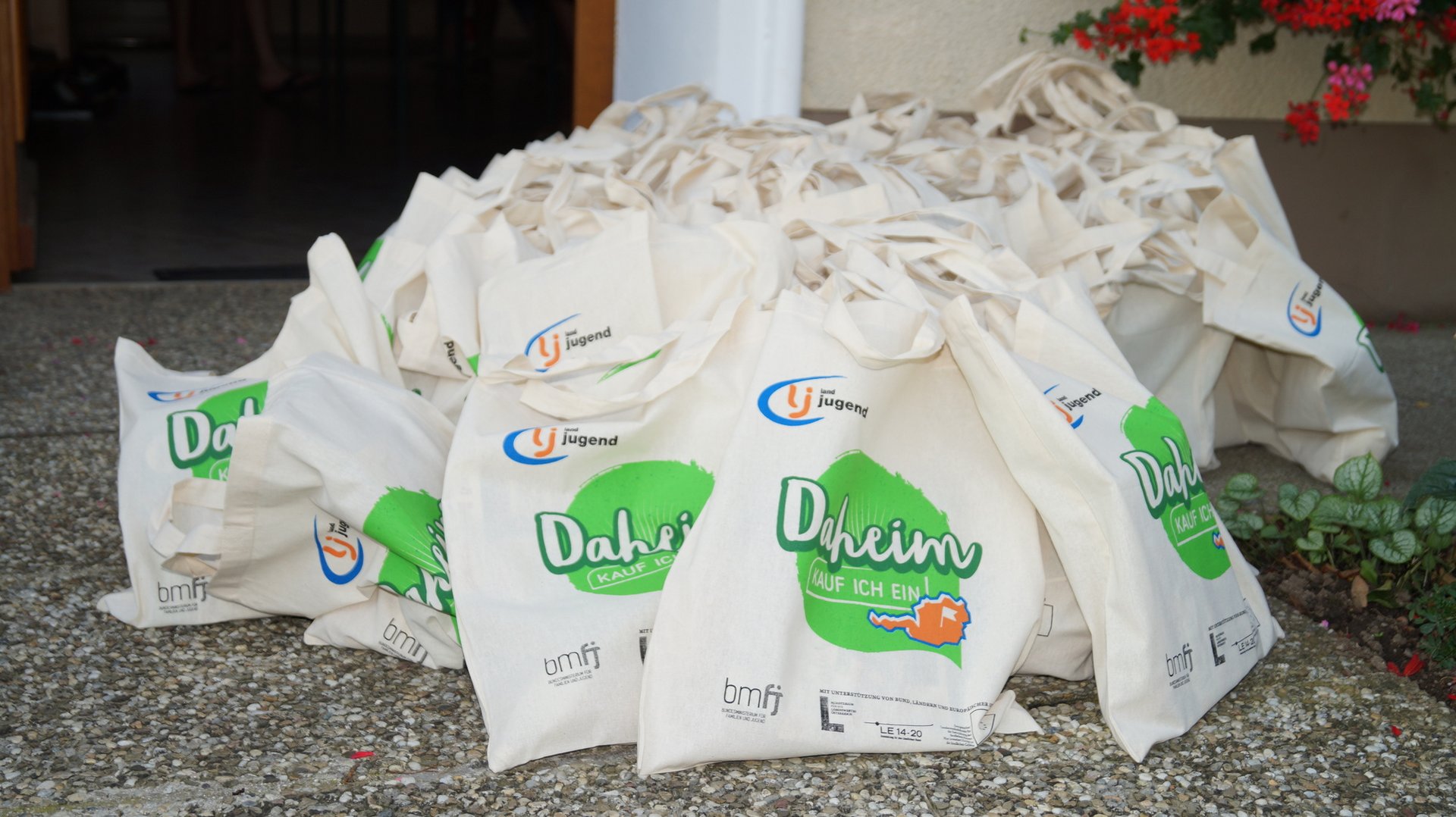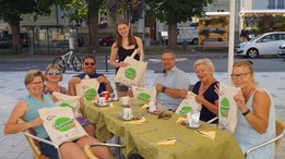 Markt- und Rathausplatz die „Daheim kauf ich ein“-Taschen, welche von der