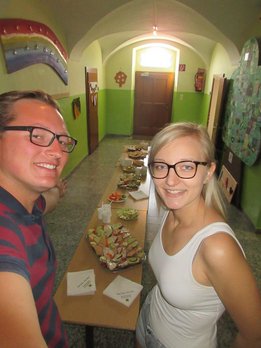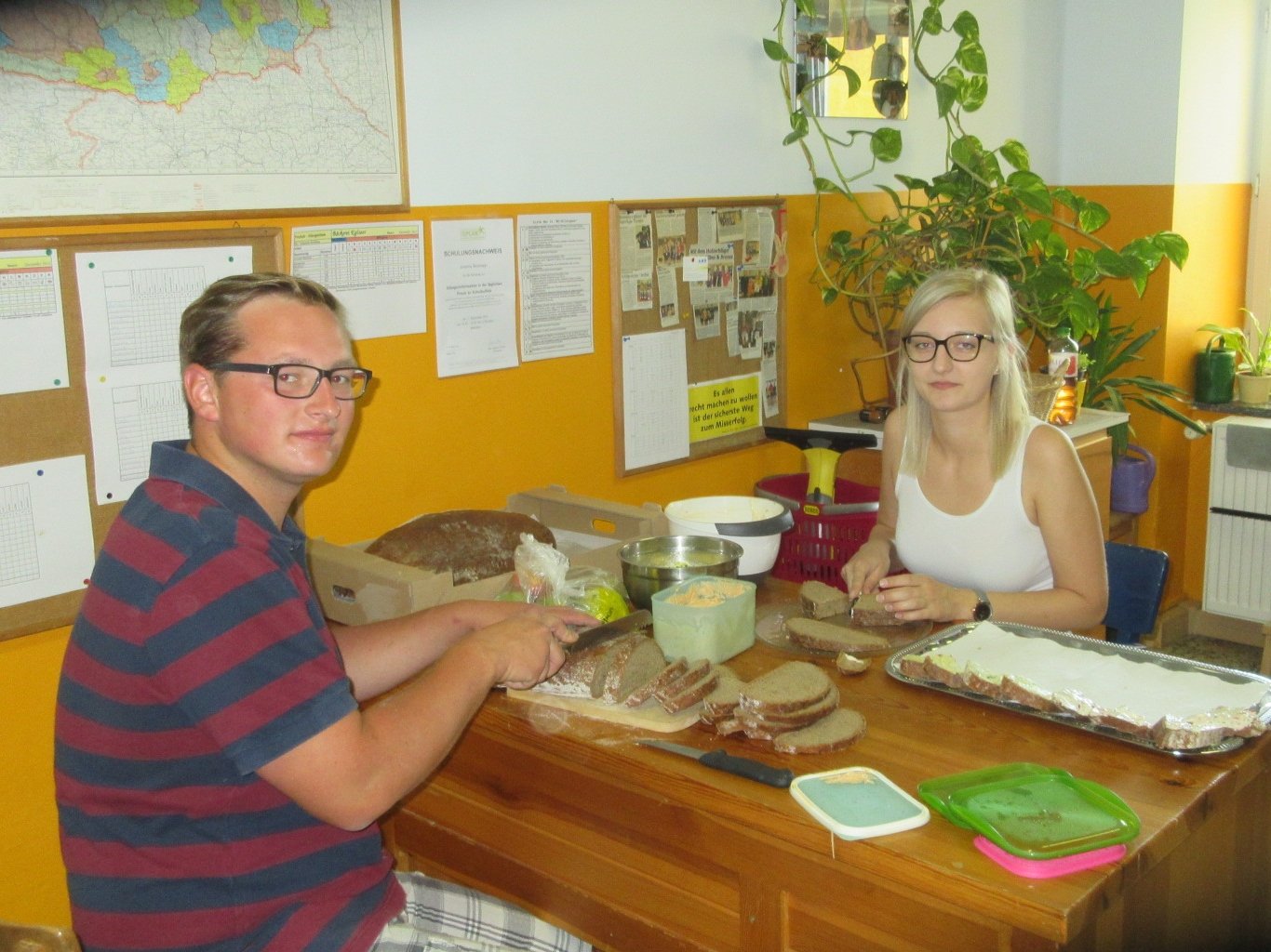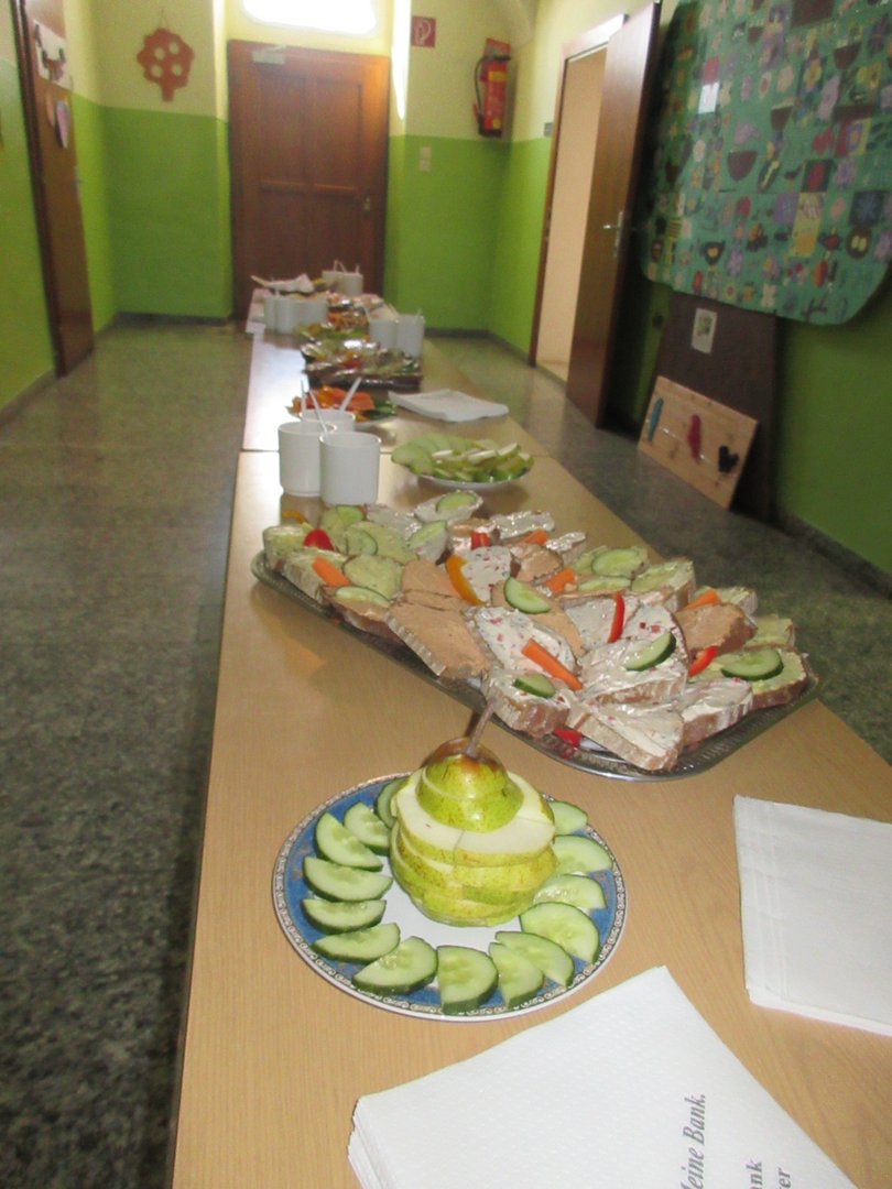 Obstsalat zubereitet. Neben Broten gab es auch noch Gemüsesticks und Obst. Auf